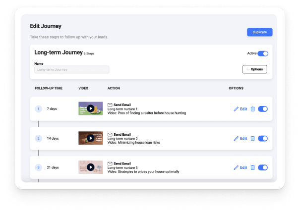 Say goodbye to manual follow-ups and hello to automated, personalized engagement that converts leads into hot prospects. With Journey Builder, you can effortlessly schedule and deliver targeted text messages and emails, enriched with captivating real estate videos, to nurture your leads at specific dates.